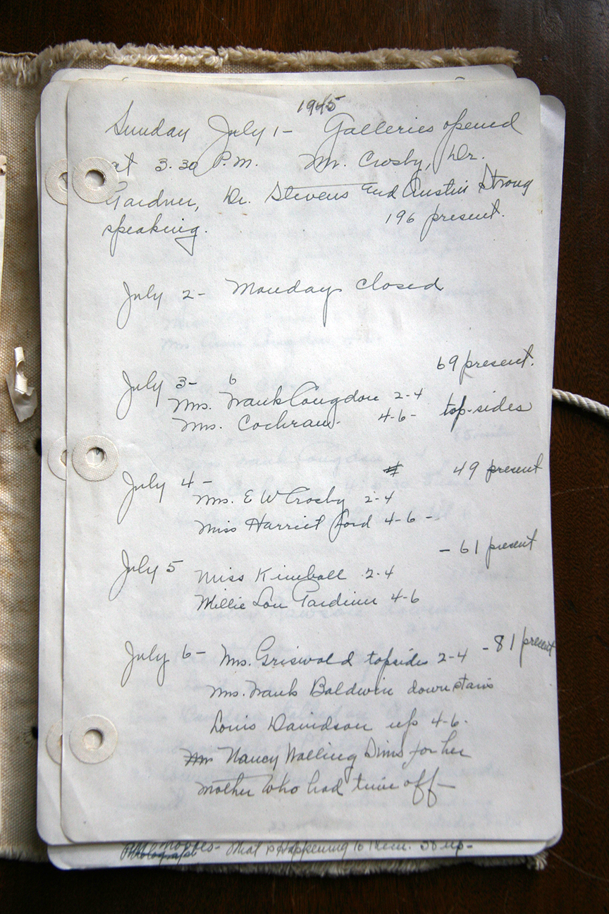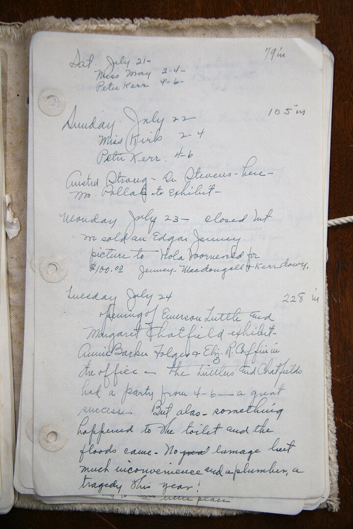 The sample page handwritten by Georgie Walling, from July, announces the opening of the Emerson Tuttle exhibiton, 7-24-1945, which held an opening party (with a toilet disaster).