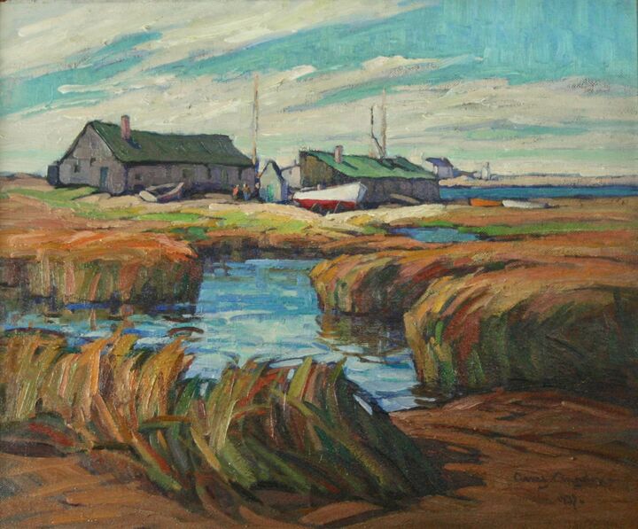 By the mid-1920s, a second famous Chase influenced Congdon’s adult art career. She engaged in summer classes in oil painting with Frank Swift Chase (1886-1958) on Nantucket, and she rapidly became an en plein air painter in the bold style of her new mentor. The Boston Herald observed, “Her work is direct, facile, and without mannerisms.” She painted a series of waterfront paintings after island painter Edgar W. Jenney (1869-1939) suggested that she study reflections on the harbor waters. For larger works, Congdon often worked on a precursor of modern masonite, preferring the rough side for her thick impasto technique. At times she would use wide, quick marks to finish the foreground of a scene. If a painting wasn’t completed in one sitting, she would often dismiss it or paint over it. As essayist Carolyn Walsh observed, “under Chase’s influence, her canvases grew larger and her expression more exaggerated; reminiscent of Van Gogh and the Post Impressionists.”