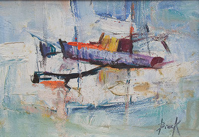 A Canadian who had worked in the maritime industries and wrote about it, Brock Davis summered here from the 1950’s through the ‘80’s, and she studied with Philip Burnham Hicken in his studio at 23 Pine Street. Her first show at The Little Gallery was of “abstracted” work. During the 1940s she studied in Montreal with Arthur Lismer (1885-19690), one of Canada’s famed Group of Seven.