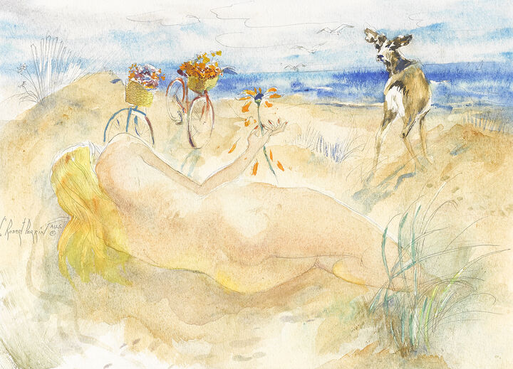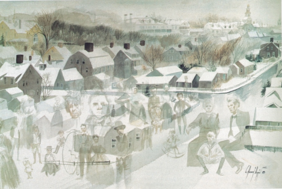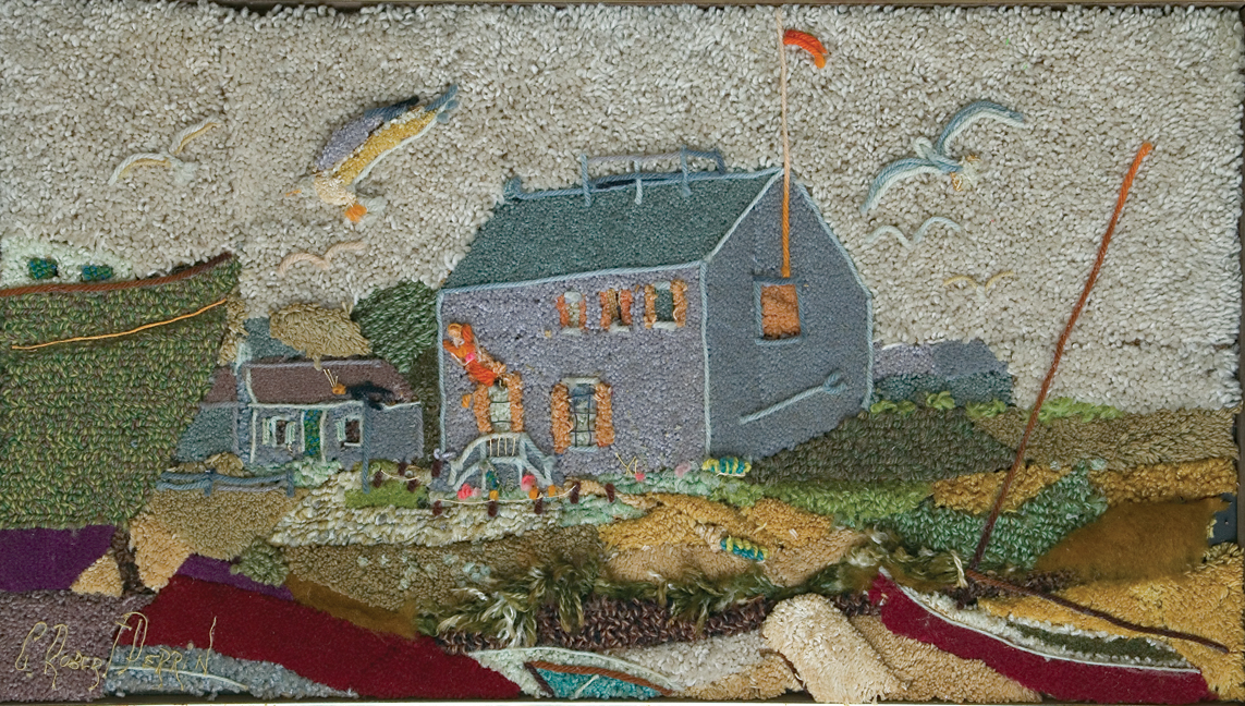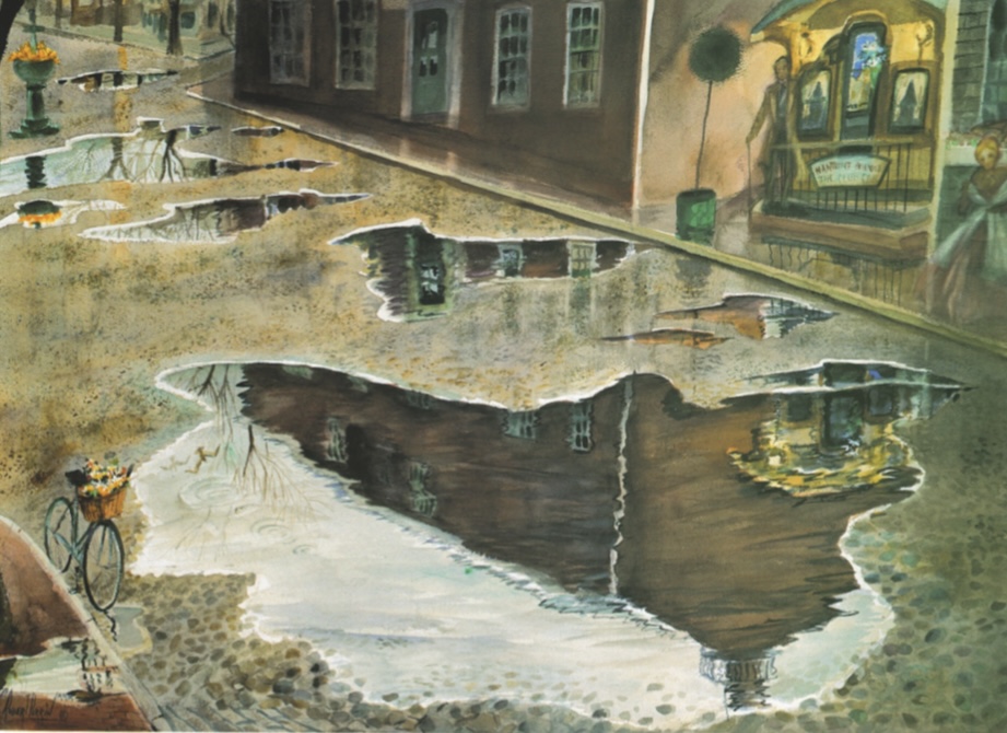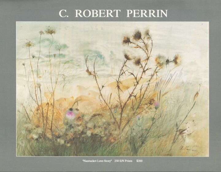 Perrin’s inventive nature led to a variety of endeavors. He illustrated children’s books with characters like Nancy Tucket and the Whopper, and experimented in other media, including fiber arts collage. As reported in American Artist magazine in 1959, he converted his Volkswagen bus to an en plein air studio on wheels. Perrin favored Payne’s gray for his signature ghosts and puddles imagery, and he campaigned successfully against its discontinuation by a major watercolor manufacturer. He made art in three distinct periods: Perrin Puddle Period, concentrating on sights from the wharf and Nantucket’s puddles; Queen Anne Lace Period, featuring open fields, flowers, baskets, etc; and Ghosty Period, dominated by Nantucket houses and beaches with transparent ghosts of earlier Nantucketers. Many locals remember him wearing a top hat and carrying a giant pocket watch during special events.