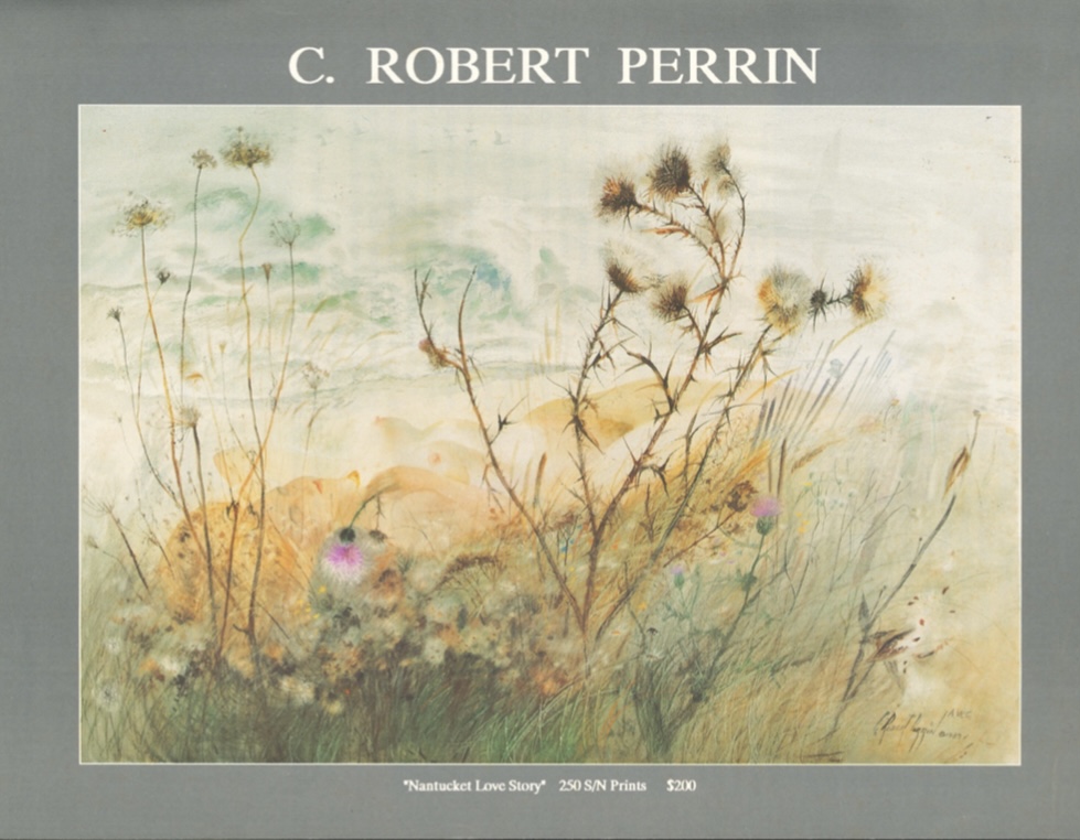 Robert Perrin was born in Medford, Massachusetts and studied art at the School of Practical Art in Boston (now called Art Institute of Boston). Perrin was a pioneer on Old South Wharf, where his converted fishing shanty evolved into the first art gallery on the wharf in 1956. Perrin migrated to the island in 1946 after serving in the U.S. Army where he painted a large mural at the United States Officers’ Club in Chateau Thierry, France. By the mid-1960s, he had moved permanently to Washington Street, where he held weekly watercolor demonstrations during the summer.