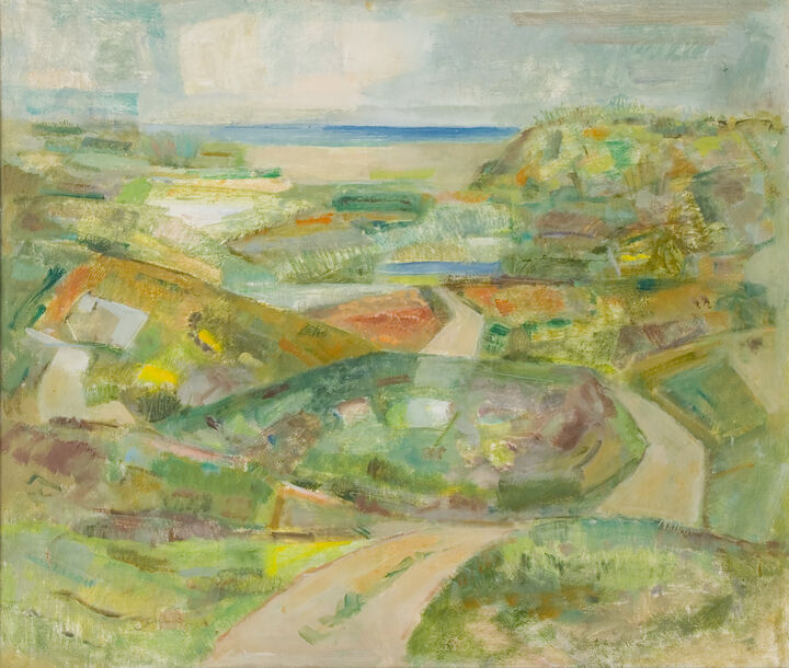 From the early 1940s until her death, Kimball spent her summers in studio apartments in the neighborhood of Commercial Wharf. She was a founding member of the 45 Group, an informal association of artists who promoted modernism in their exhibitions at the Kenneth Taylor Galleries. She also served as an active member of the Artists Association of Nantucket and on its executive committee. She showed regularly in the Sidewalk Art Show, the Kenneth Taylor Galleries, and the Candle House Studio. An art teacher off-island at the Baltimore Museum of Art and several private schools, Kimball held exhibitions at the Baltimore Museum of Art and the Phillips Collection.