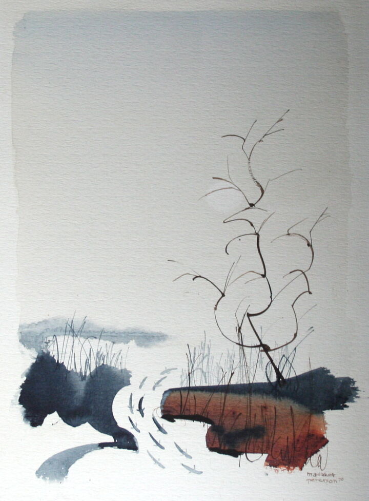 “If I went any farther, I might blow it.” Dick’s paintings are nature studies with an oriental flavor, and usually contain birds. “I’m not a bird watcher,” he said, “but somehow there is always a bird there with me when I am painting. And the birds add life to the paintings.”