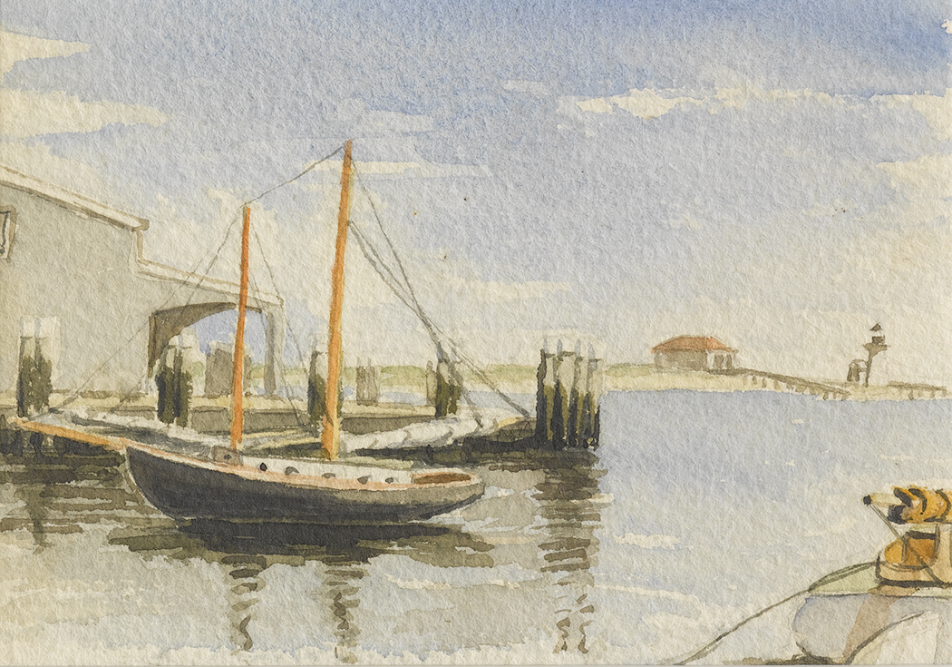 Based in the Wharfhead Studio on Old North Wharf after moving to town from ’Sconset in 1940, Doris and her husband Richard produced a well-known series of watercolor miniatures featuring popular Nantucket scenes. The couple frequently worked together on these copyrighted creations, photo-duplicating Doris’s line sketch and Doris and Richard completing the watercolor.