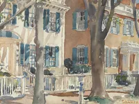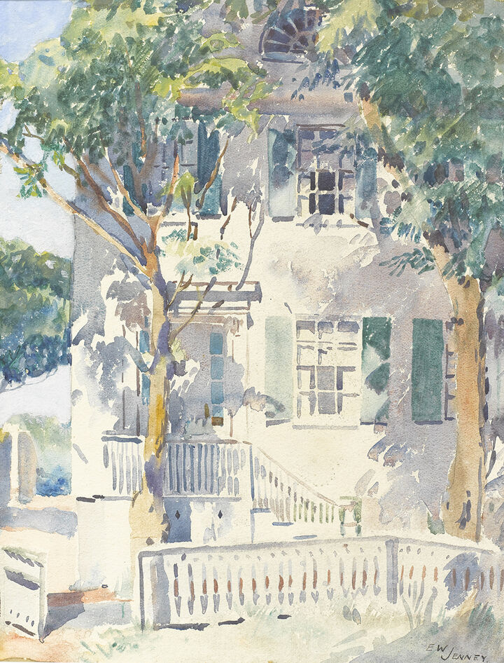 Jenney was a diversely talented artist, illustrator, interior designer, and architectural draughtsman who became a prominent member of the Art Colony after his retirement from professional life in New York City in 1927 (he purchased a home at 13 Vestal Street). An early preservationist, he created a brilliant series of watercolor interiors of historic Nantucket houses and buildings in the 1930s, imparting a vibrancy of color, light, and pattern to the material content and ornamental details of grand old Nantucket houses and public buildings—an emphasis that had wide appeal during the height of the Depression.