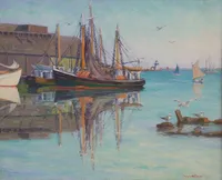 Note: Her painting, once renamed “Black and Green Fishing Boat”, was originally titled “By the Wharf” and purchased for the Permanent Collection, noted in I&M, August 30, 1952.