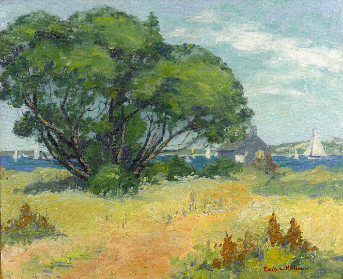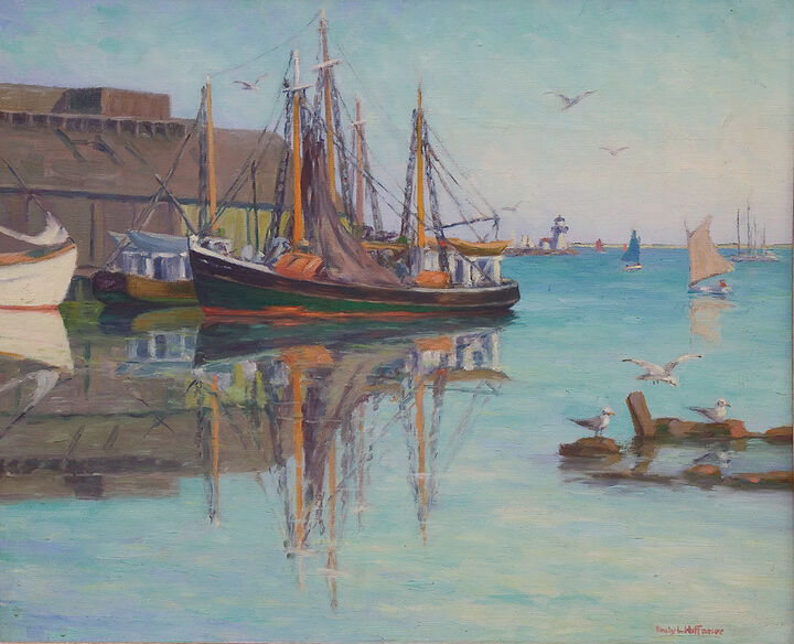 From 1929 to her death in 1952, Emily Hoffmeier spent summers on Nantucket, painting in the waterfront studios—first Harborview No. 3 and later moving to the Red Anchor Studio on Washington Street. She exhibited in the Easy Street Gallery, the Candle House Studio, and later at the Kenneth Taylor Galleries. After the death of Maud Stumm in 1935, Hoffmeier took over the direction of the annual Sidewalk Art Show, which she ran for the next eighteen years “with untiring cheerfulness and unflagging interest.” She was one of the founding members of the Artists Association of Nantucket and served on its first executive committee.