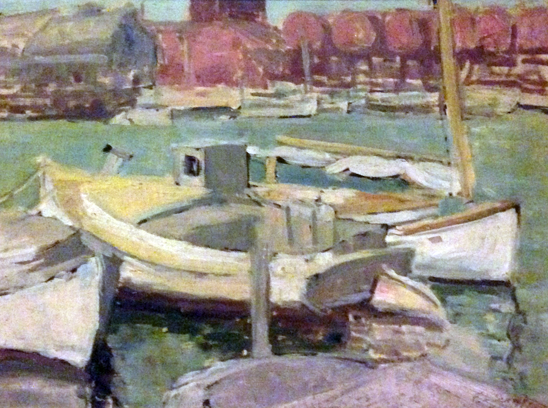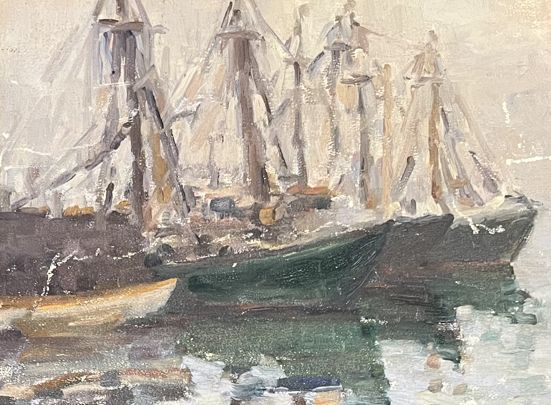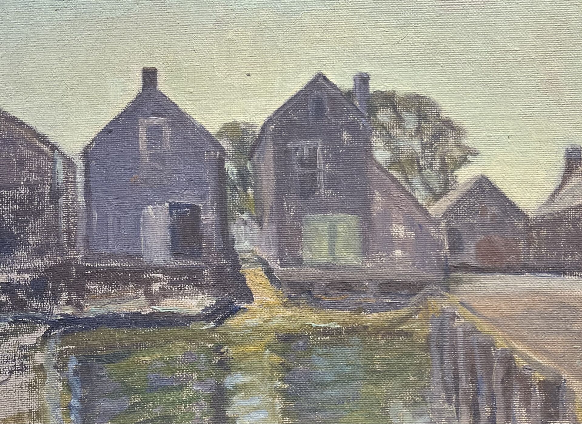 Florence L. Schepp (1977-1964) was a member of AAN for our first 20 years. Four of her five artworks in an acquisition gifted to AAN by the Nantucket Cottage Hospital depict Old North Wharf and the Easy Street Basin ca. 1930-50. She lived across the street from the Easy Street Gallery, and one of the gifted works (left in the photo of the four) is a view made from North Wharf looking back down the basin. It shows her home and the gallery. Schepp exhibited at the Kenneth Taylor Galleries, the Easy Street Gallery (which she helped fund), and at the annual Sidewalk Art Shows. She was a student of island artist Edgar W. Jenney (1869-1939) in the 1930’s and later studied with Frank Swift Chase. After her father’s death in 1926, Florence oversaw the Leopold Schepp Foundation and devoted her life to the Foundation’s support of the arts.