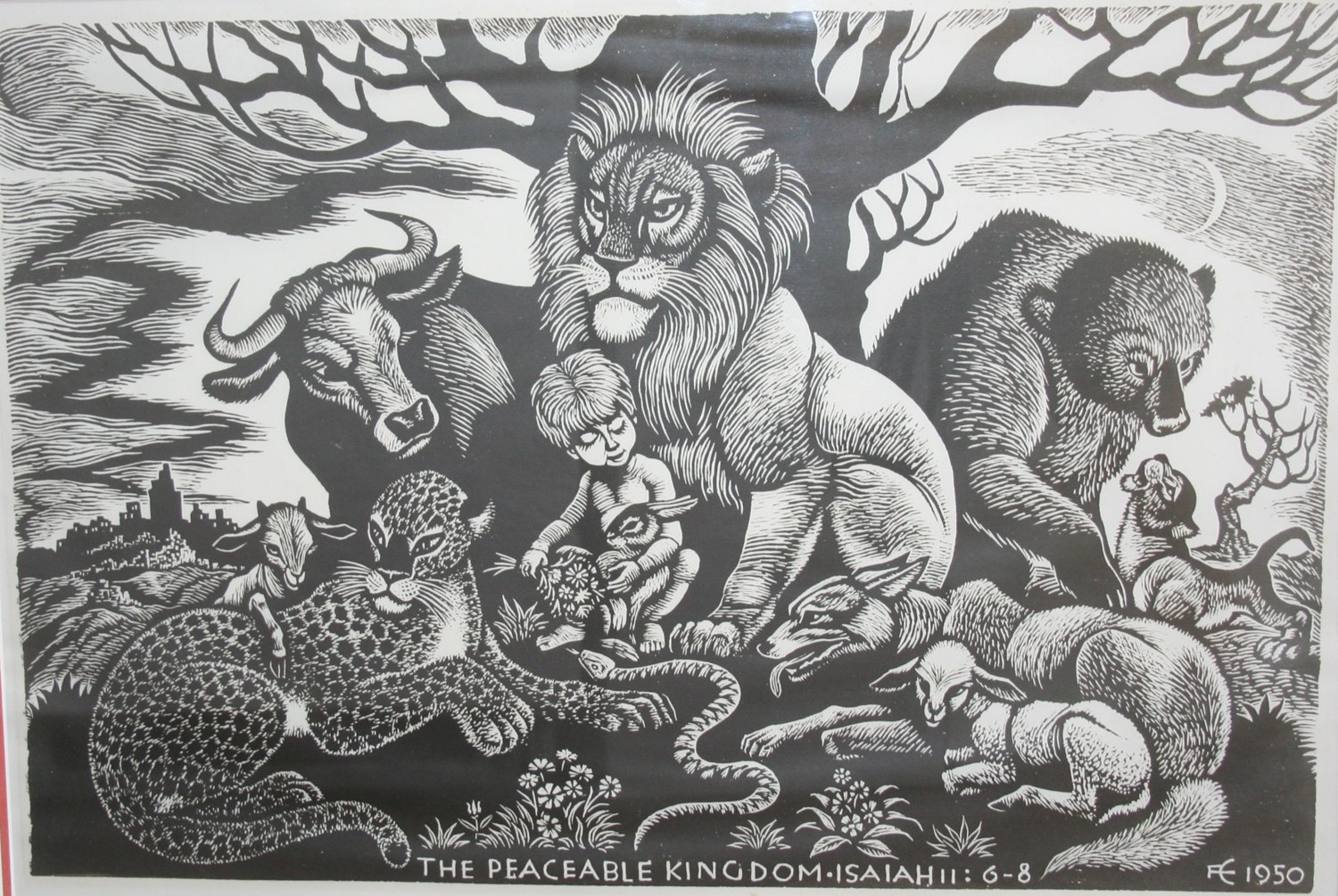 Eichenberg became a member of the Religious Society of Friends in 1940, shortly after the sudden death of his first wife. He wrote and illustrated two pamphlets, Art and Faith (1952) and Artist on the Witness Stand (1984), for the Quaker-affiliated press, Pendle Hill Publications. It is perhaps his religious images that provide a glimpse of the persona to which Eichenberg aspired, and were most personally rewarding.