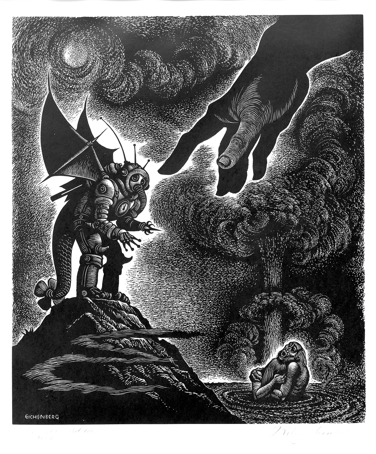 He found that book illustration was a suitable medium for his personality, as he found literature to be a means for personal escape. Eichenberg brought his own intense identification with the author and the characters to his illustrations, thus his images opened a new world for the reader’s understanding of a text. Already established as successful and prosperous commercial illustrator of literature, in 1949 when he met the Christian social justice activist Dorothy Day, he began a parallel career as an illustrator of religious images for Day’s newspaper The Catholic Worker.