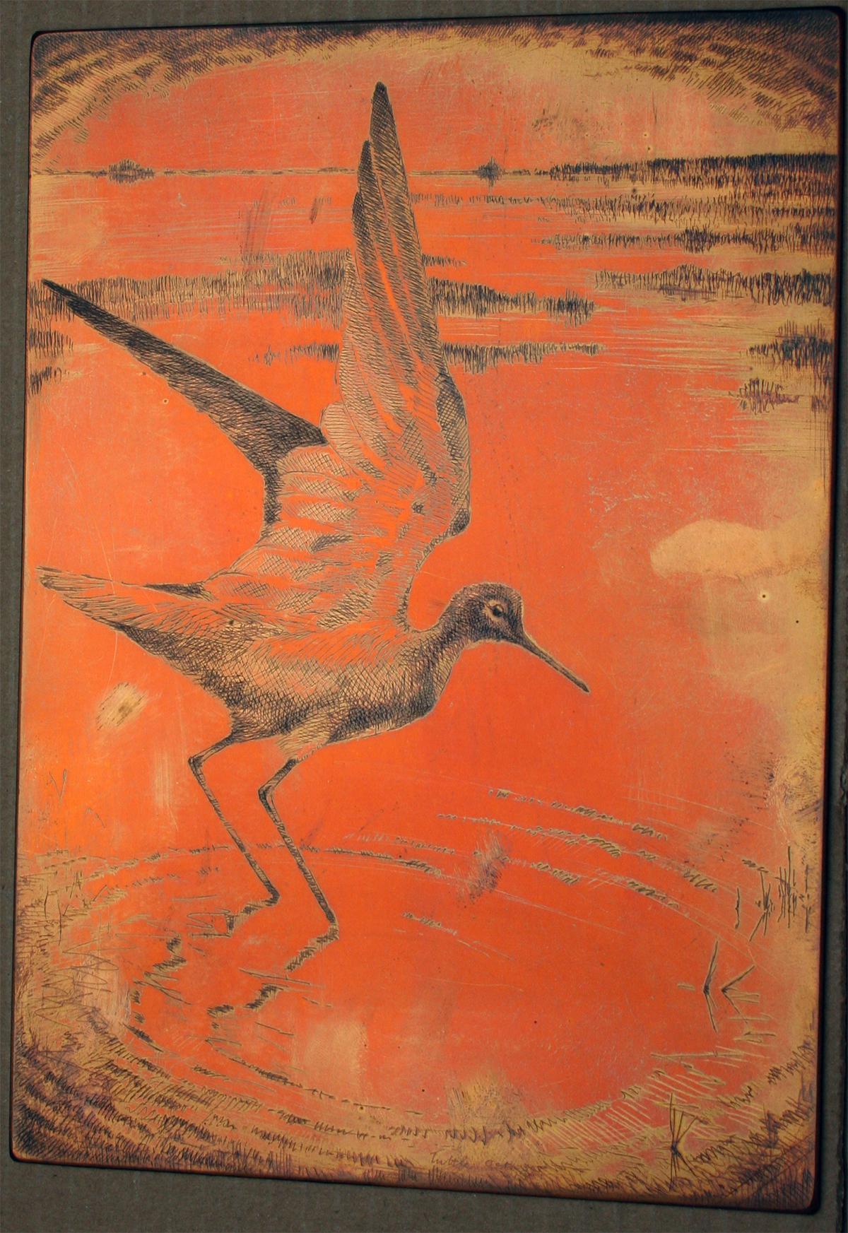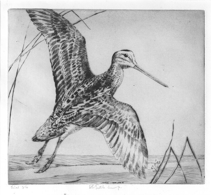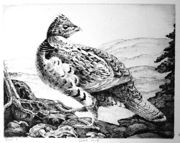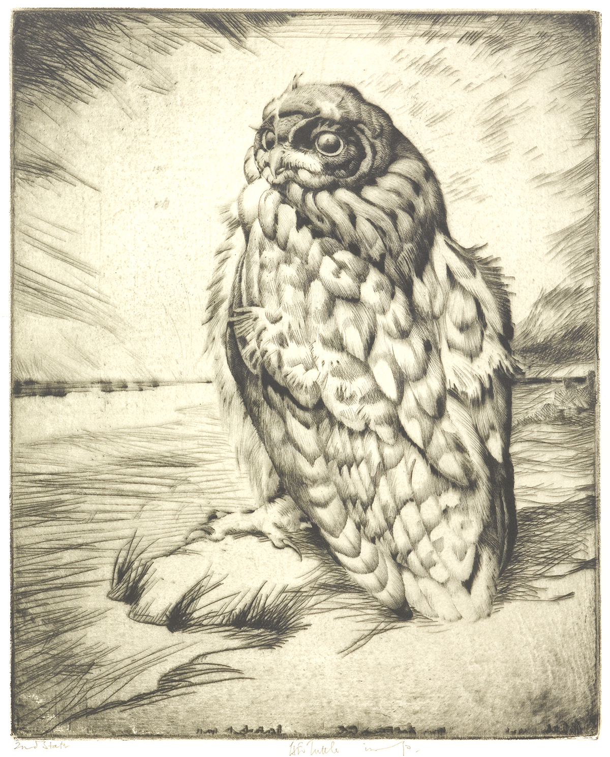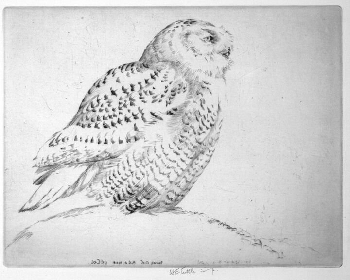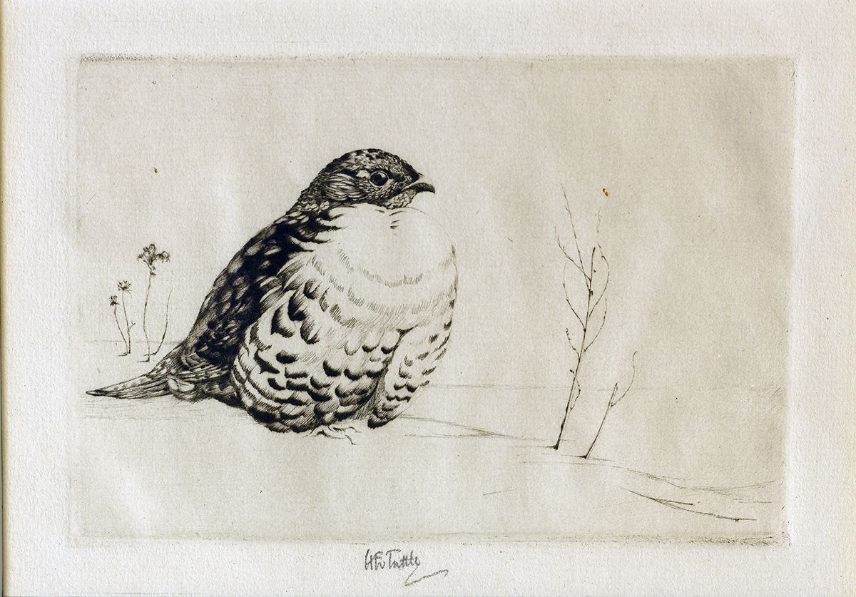 Emerson Tuttle was renowned for his etchings of birds and was Curator of Prints at the Yale University Art Gallery in the ‘30’s and early ‘40’s, as well as a member of the Brooklyn Society of Etchers. First president of the AAN (he died before serving out his year), he and his wife Isabelle Hollister Tuttle were powerful voices in the formation of the association. Isabelle often recalled her husband sitting in a blind for days sketching birds for his prints.