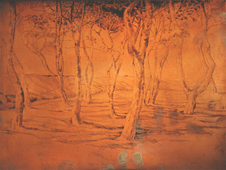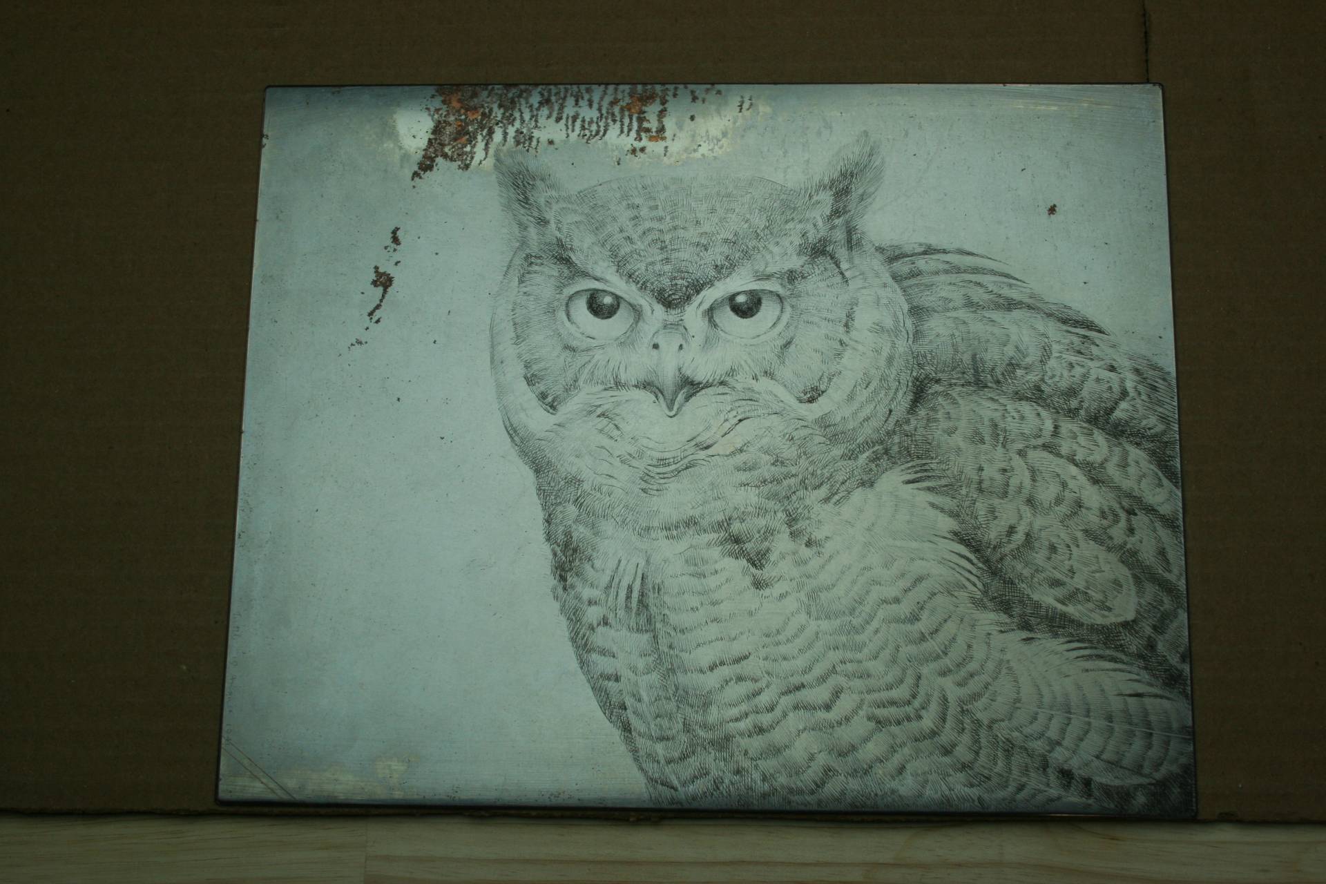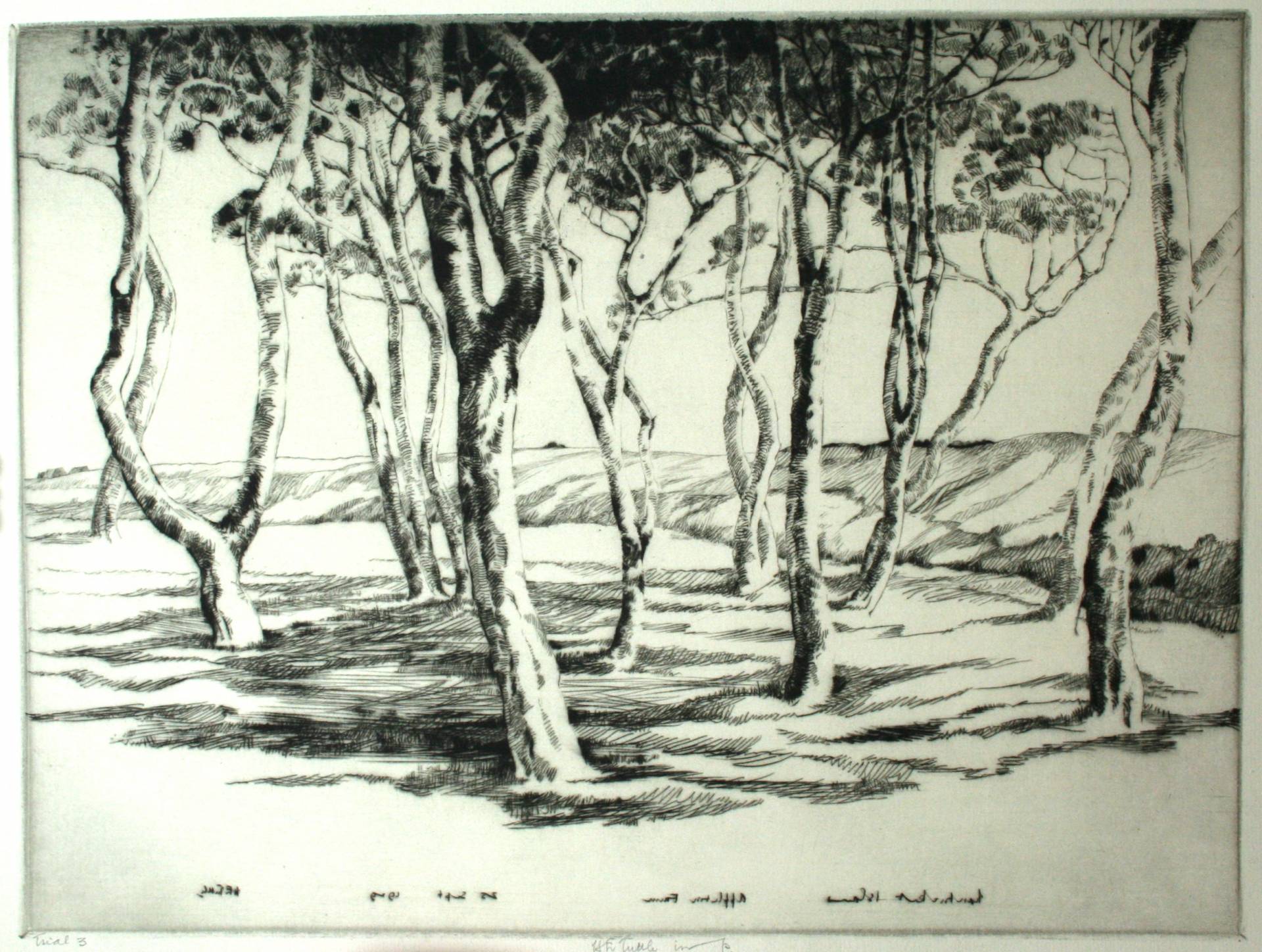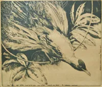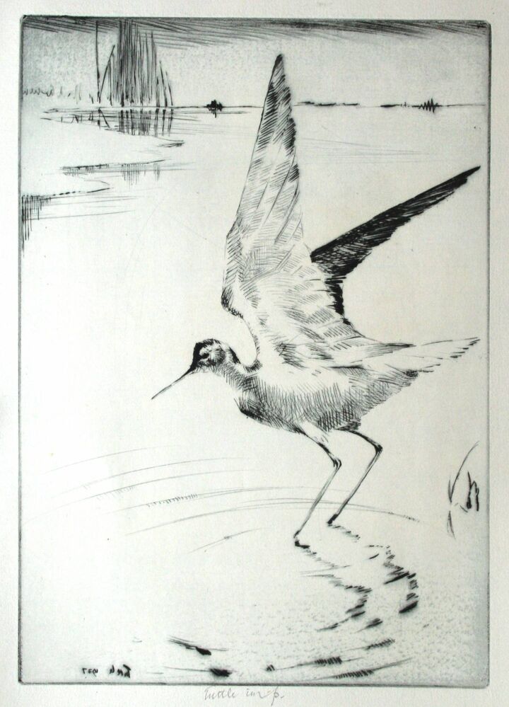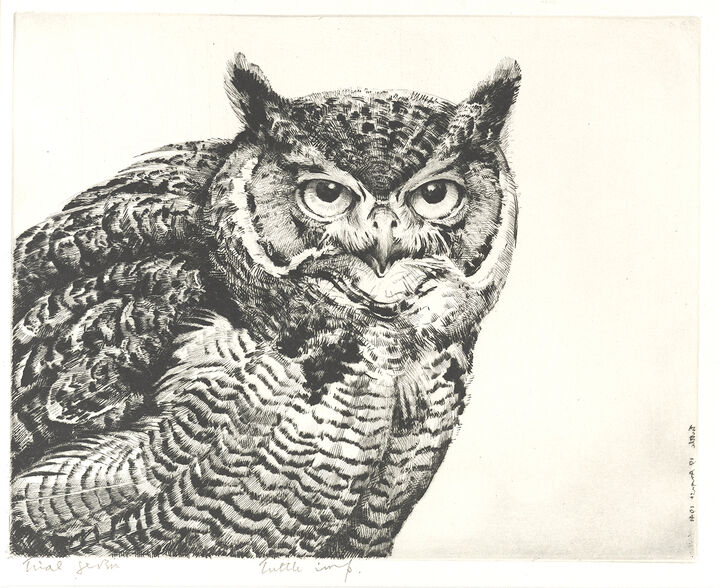 Emerson Tuttle was renowned for his etchings of birds and was Curator of Prints at the Yale University Art Gallery in the ‘30’s and early ‘40’s, as well as a member of the Brooklyn Society of Etchers. First president of the AAN (he died before serving out his year), he and his wife Isabelle Hollister Tuttle were powerful voices in the formation of the association. Isabelle often recalled her husband sitting in a blind for days sketching birds for his prints.