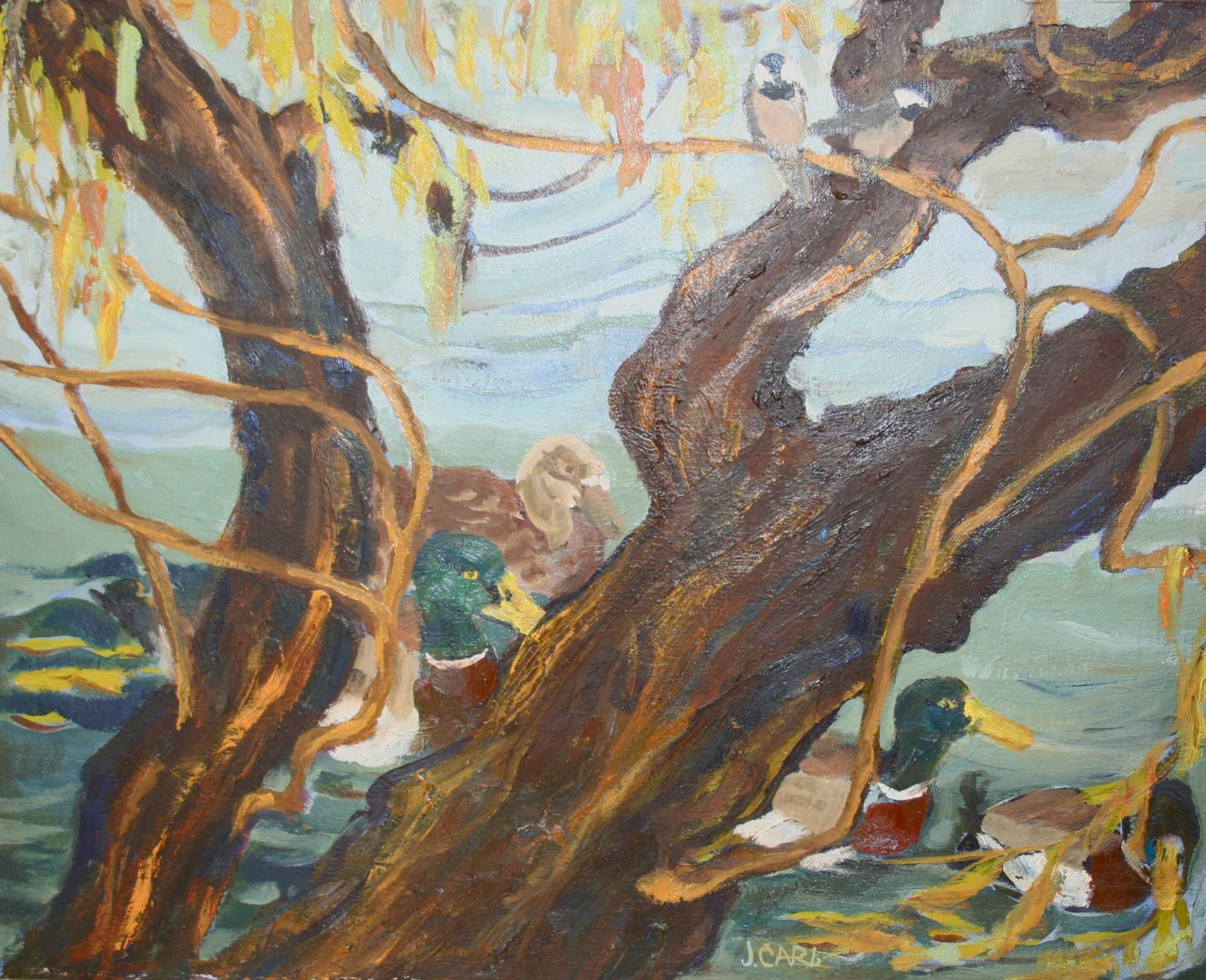 Educated at the Art Center in San Francisco and William Patterson College in New Jersey. She used to paint watercolors “en plein air” and then worked out of her studio at 3 Chestnut Street with her husband, fiber artisan Jerry Carl. She met Jerry in art school and married in 1948. Jeannette also sculpted clay and wove baskets and shorebirds out of rattan reed. One of the few AAN painters who regularly used the alkyd medium.