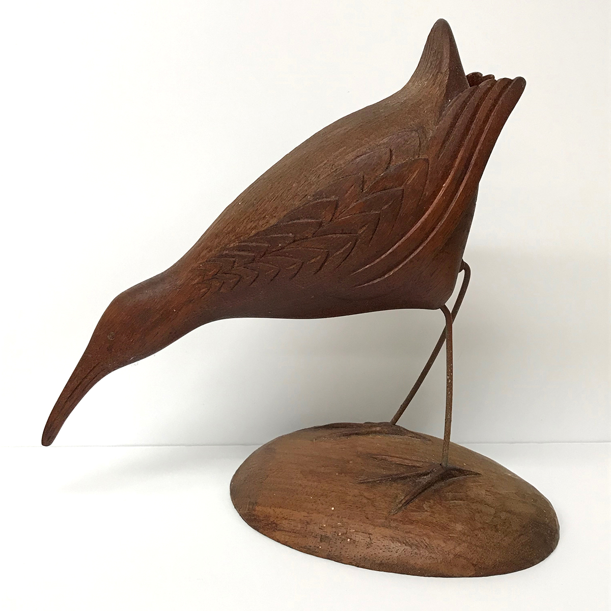 At first, Pat carved birds by copying the many antique decoys owned by her family on the farm. As she grew proficient, her painted birds were influenced by traditional carvers of the 19th and 20th century, yet her hardwood birds in walnut and mahogany employed streamlined shapes in a very personal style. She even chiseled freeform sculpture. “I like abstract natural wood objects,” said Pat. “The wood dictates what the shape will be. It’s exciting because you’re really not in control of it.”