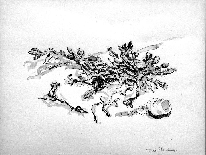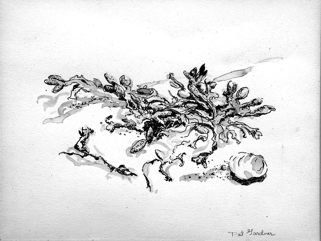 If you parked in the circular driveway by Pat Gardner’s cottage on Hummock Pond Road, you faced her workshop and studio. When you entered the doorway, you’d first spy the framed pastel of Pat as a young girl, rendered by a dear friend of her youth. Beyond that you’d find a tiny space with her framed art and a few carved birds. The main workshop section of the building housed chisels, drills, rasps, saws, hammers, and an array of old hand tools mounted on the walls between and around the windows. Her favorite beech wood mallet sat on one of the plywood-topped benches, a narrow surface that sported a large woodworker’s vise, its flat jaws lined with soft wood for a grip on her latest bird carving. Another bench displayed more finished birds and abstract sculptures. Shelves built into a pegboard supported a semi-organized mass of tins and jars of paintbrushes. On a homemade taboret sat a small fine art printing press. A long striped apron hung from a hook.
