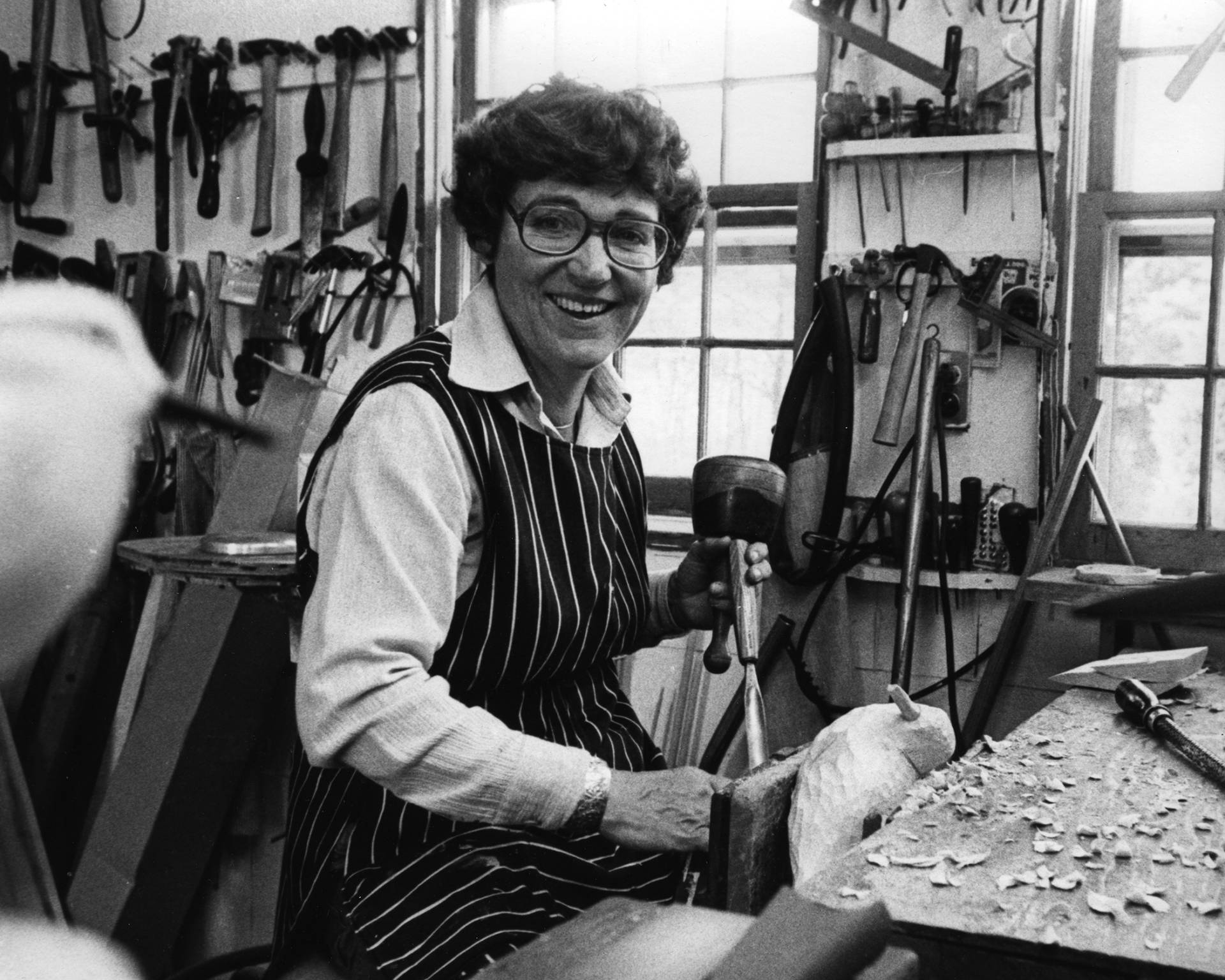 After graduating Skidmore in 1948 with a fine arts degree, Pat learned illustration in Seattle at the Cornish School of Art, which led her to Rhode Island and an eight-year stint rendering detailed international maps from U.S. Army aerial photography. She returned to the island in 1960, the year that Sutton passed away, “looking for ways to get back into art work.” Taking an unconventional approach, she began to repair and refinish furniture in what she termed “an apprentice sort of way” with clockmaker Earl S. Ray. “I was learning what I could by helping him. I learned about carving tools and how to use the electrical tools in the shop.” She also studied with Aletha Macy, who worked in both wood and ivory.
