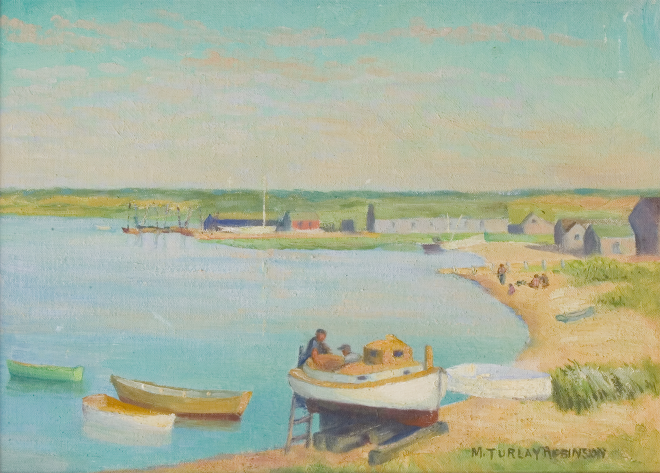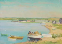 In 1933, Robinson came to Nantucket and became a summer resident of Siasconset, and an active participant in the island’s artist colony. She exhibited at the Candle House Studio and at the Easy Street Gallery; later at the Kenneth Taylor Gallery as a member of AAN.
