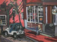 Bob liked to work a canvas propped on his latest invention: a nifty portable easel that straps around the nearest tree or phone pole and holds the canvas, a wedge of palette board and a coffee tin for the brushes and water (he works in acrylics). He’d oftern paint a canvas (on a cumbersome easel) next to the white gate of the Maria Mitchell Library — shingled walls drenched in light and shadowy pavement where spaces opened up or dwindled according to his whim. Another favorite subject - the alley that runs from Hardy’s parking lot down behind the Four Winds and the Little Gallery and Aunt Leah’s Fudge to the courtyard at the beginning of Straight Wharf proper. He prefered the hidden streets downtown, and he captured them.