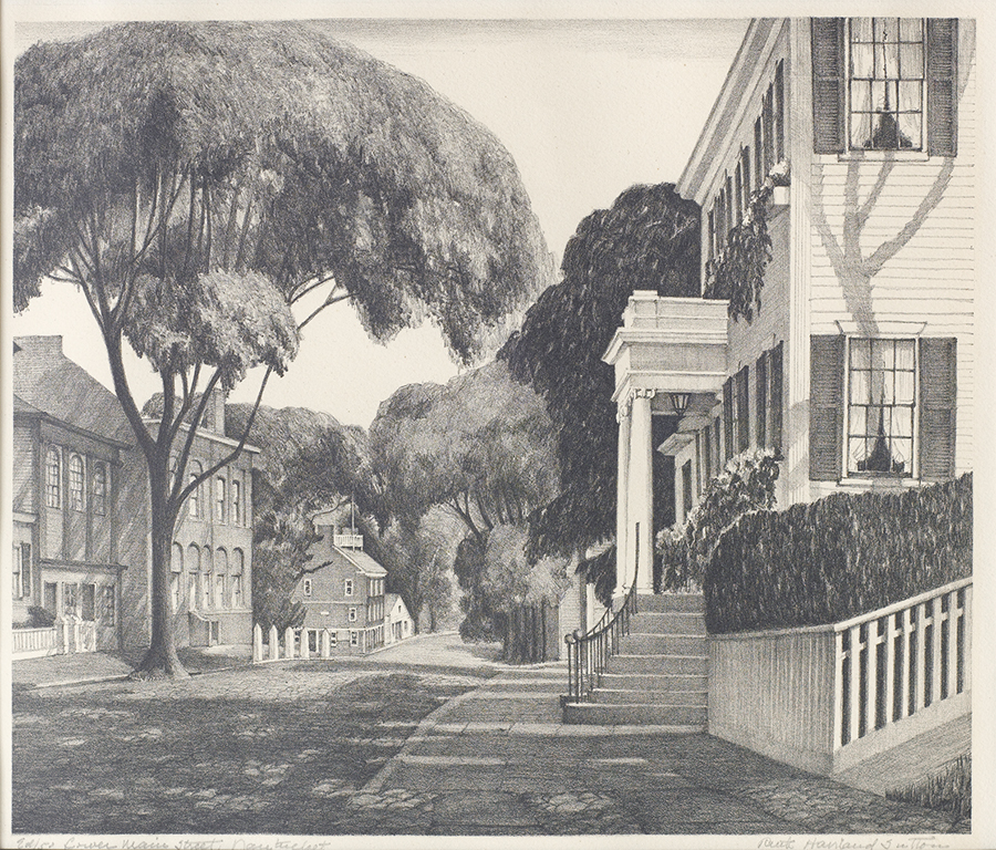 On Nantucket, she studied under Frank Swift Chase. Sutton began summering on island in 1924, and in 1943 she purchased a number of properties on Commercial Wharf that had been refurbished into artist studios by Florence Lang. After modernizing them, she rented the others to members of the island’s artist colony. In 1950 she remodeled the Candle House Studio into a home and adjoining studio for herself.